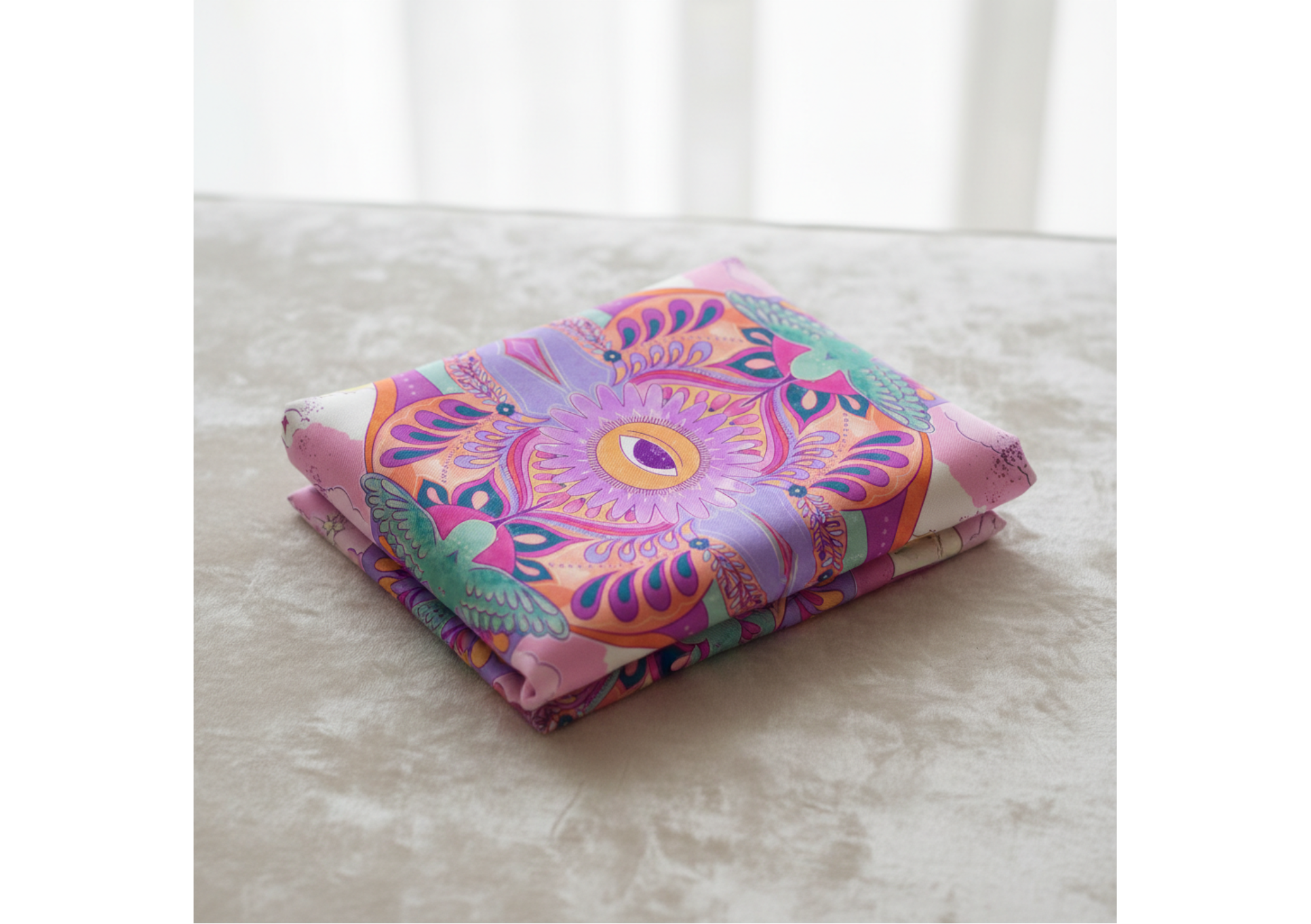 Este lenço, foi idealizado como um amuleto protetor. A estampa deste lenço nasce de uma pintura original, inspirada no beija-flor enquanto animal de poder.